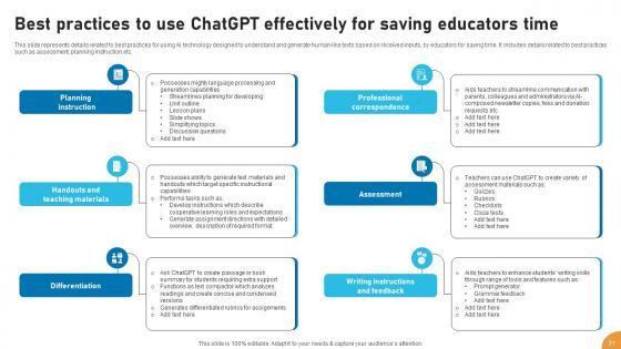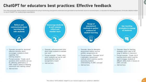 This slide represents details related to best practices for using AI technology designed to understand and generate human-like texts based on received inputs, by educators for saving time. It includes details related to best practices such as assessment, planning instruction etc. Create an editable Best Practices To Use ChatGPT Effectively For Applications Of ChatGPT In Education ChatGPT SS V that communicates your idea and engages your audience. Whether you are presenting a business or an educational presentation, pre-designed presentation templates help save time. Best Practices To Use ChatGPT Effectively For Applications Of ChatGPT In Education ChatGPT SS V is highly customizable and very easy to edit, covering many different styles from creative to business presentations. Slidegeeks has creative team members who have crafted amazing templates. So, go and get them without any delay. This slide represents details related to best practices for using AI technology designed to understand and generate human-like texts based on received inputs, by educators for saving time. It includes details related to best practices such as assessment, planning instruction etc.