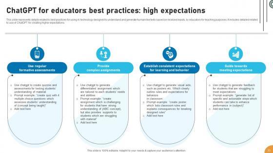 This slide represents details related to best practices for using AI technology designed to understand and generate human-like texts based on received inputs, by educators for teaching purposes. It includes detailed related to use of ChatGPT for creating higher expectation. If you are looking for a format to display your unique thoughts, then the professionally designed ChatGPT For Educators Best Practices Effective Applications Of ChatGPT In Education ChatGPT SS V is the one for you. You can use it as a Google Slides template or a PowerPoint template. Incorporate impressive visuals, symbols, images, and other charts. Modify or reorganize the text boxes as you desire. Experiment with shade schemes and font pairings. Alter, share or cooperate with other people on your work. Download ChatGPT For Educators Best Practices Effective Applications Of ChatGPT In Education ChatGPT SS V and find out how to give a successful presentation. Present a perfect display to your team and make your presentation unforgettable. This slide represents details related to best practices for using AI technology designed to understand and generate human-like texts based on received inputs, by educators for teaching purposes. It includes detailed related to use of ChatGPT for creating higher expectations.