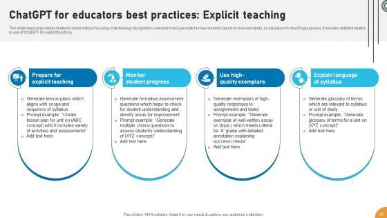 This slide represents details related to best practices for using AI technology designed to understand and generate human-like texts based on received inputs, by educators for teaching purposes. It includes detailed related to use of ChatGPT for explicit teaching. Are you in need of a template that can accommodate all of your creative concepts This one is crafted professionally and can be altered to fit any style. Use it with Google Slides or PowerPoint. Include striking photographs, symbols, depictions, and other visuals. Fill, move around, or remove text boxes as desired. Test out color palettes and font mixtures. Edit and save your work, or work with colleagues. Download ChatGPT For Educators Best Practices Explicit Applications Of ChatGPT In Education ChatGPT SS V and observe how to make your presentation outstanding. Give an impeccable presentation to your group and make your presentation unforgettable. This slide represents details related to best practices for using AI technology designed to understand and generate human-like texts based on received inputs, by educators for teaching purposes. It includes detailed related to use of ChatGPT for explicit teaching.