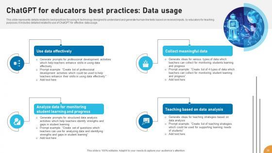 This slide represents details related to best practices for using AI technology designed to understand and generate human-like texts based on received inputs, by educators for teaching purposes. It includes detailed related to use of ChatGPT for effective data usage. If your project calls for a presentation, then Slidegeeks is your go-to partner because we have professionally designed, easy-to-edit templates that are perfect for any presentation. After downloading, you can easily edit ChatGPT For Educators Best Practices Data Usage Applications Of ChatGPT In Education ChatGPT SS V and make the changes accordingly. You can rearrange slides or fill them with different images. Check out all the handy templates This slide represents details related to best practices for using AI technology designed to understand and generate human-like texts based on received inputs, by educators for teaching purposes. It includes detailed related to use of ChatGPT for effective data usage.