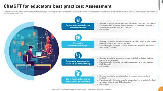 This slide represents details related to best practices for using AI technology designed to understand and generate human-like texts based on received inputs, by educators for teaching purposes. It includes detailed related to use of ChatGPT for assessment. Whether you have daily or monthly meetings, a brilliant presentation is necessary. ChatGPT For Educators Best Practices Assessment Applications Of ChatGPT In Education ChatGPT SS V can be your best option for delivering a presentation. Represent everything in detail using ChatGPT For Educators Best Practices Assessment Applications Of ChatGPT In Education ChatGPT SS V and make yourself stand out in meetings. The template is versatile and follows a structure that will cater to your requirements. All the templates prepared by Slidegeeks are easy to download and edit. Our research experts have taken care of the corporate themes as well. So, give it a try and see the results. This slide represents details related to best practices for using AI technology designed to understand and generate human-like texts based on received inputs, by educators for teaching purposes. It includes detailed related to use of ChatGPT for assessment.