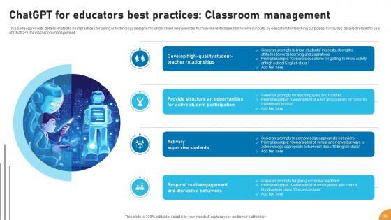 This slide represents details related to best practices for using AI technology designed to understand and generate human-like texts based on received inputs, by educators for teaching purposes. It includes detailed related to use of ChatGPT for classroom management. Find highly impressive ChatGPT For Educators Best Practices Classroom Applications Of ChatGPT In Education ChatGPT SS V on Slidegeeks to deliver a meaningful presentation. You can save an ample amount of time using these presentation templates. No need to worry to prepare everything from scratch because Slidegeeks experts have already done a huge research and work for you. You need to download ChatGPT For Educators Best Practices Classroom Applications Of ChatGPT In Education ChatGPT SS V for your upcoming presentation. All the presentation templates are 100 percent editable and you can change the color and personalize the content accordingly. Download now This slide represents details related to best practices for using AI technology designed to understand and generate human-like texts based on received inputs, by educators for teaching purposes. It includes detailed related to use of ChatGPT for classroom management.