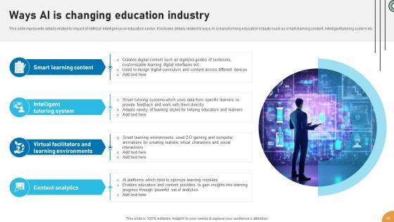 This slide represents details related to impact of Artificial intelligence on education sector. It includes details related to ways AI is transforming education industry such as smart learning content, intelligent tutoring system etc.Take your projects to the next level with our ultimate collection of Ways AI Is Changing Education Industry Applications Of ChatGPT In Education ChatGPT SS V. Slidegeeks has designed a range of layouts that are perfect for representing task or activity duration, keeping track of all your deadlines at a glance. Tailor these designs to your exact needs and give them a truly corporate look with your own brand colors they will make your projects stand out from the rest This slide represents details related to impact of Artificial intelligence on education sector. It includes details related to ways AI is transforming education industry such as smart learning content, intelligent tutoring system etc.