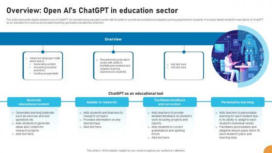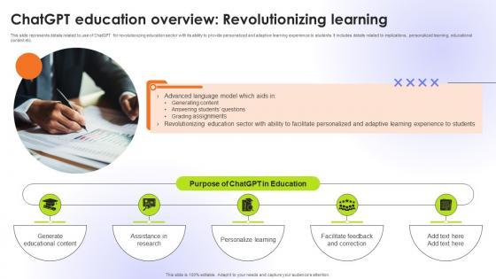 This slide represents details related to use of ChatGPT for revolutionizing education sector with its ability to provide personalized and adaptive learning experience to students. It includes details related to implications, personalized learning, educational content etc. If your project calls for a presentation, then Slidegeeks is your go-to partner because we have professionally designed, easy-to-edit templates that are perfect for any presentation. After downloading, you can easily edit ChatGPT Education Overview Revolutionizing Educational Transformation Through AI SS V and make the changes accordingly. You can rearrange slides or fill them with different images. Check out all the handy templates This slide represents details related to use of ChatGPT for revolutionizing education sector with its ability to provide personalized and adaptive learning experience to students. It includes details related to implications, personalized learning, educational content etc.
