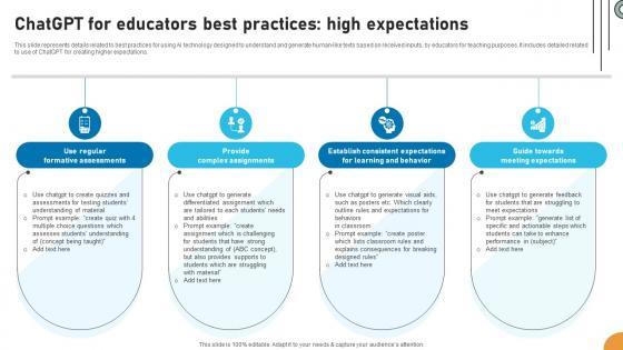 This slide represents details related to best practices for using AI technology designed to understand and generate human-like texts based on received inputs, by educators for teaching purposes. It includes detailed related to use of ChatGPT for creating higher expectations. Crafting an eye-catching presentation has never been more straightforward. Let your presentation shine with this tasteful yet straightforward ChatGPT For Educators Best Practices High Applications Of ChatGPT In Education ChatGPT SS V template. It offers a minimalistic and classy look that is great for making a statement. The colors have been employed intelligently to add a bit of playfulness while still remaining professional. Construct the ideal ChatGPT For Educators Best Practices High Applications Of ChatGPT In Education ChatGPT SS V that effortlessly grabs the attention of your audience Begin now and be certain to wow your customers This slide represents details related to best practices for using AI technology designed to understand and generate human-like texts based on received inputs, by educators for teaching purposes. It includes detailed related to use of ChatGPT for creating higher expectations.