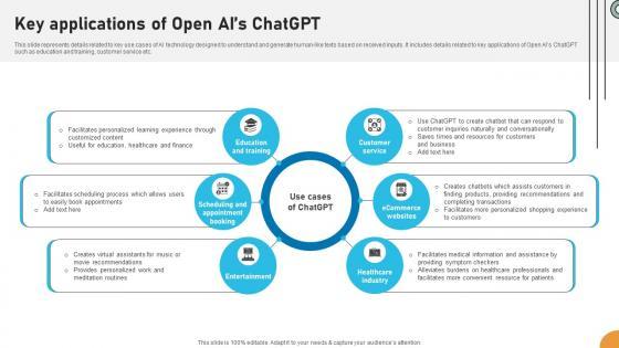 This slide represents details related to key use cases of AI technology designed to understand and generate human-like texts based on received inputs. It includes details related to key applications of Open AIs ChatGPT such as education and training, customer service etc. Coming up with a presentation necessitates that the majority of the effort goes into the content and the message you intend to convey. The visuals of a PowerPoint presentation can only be effective if it supplements and supports the story that is being told. Keeping this in mind our experts created Key Applications Of Open Ais ChatGPT Applications Of ChatGPT In Education ChatGPT SS V to reduce the time that goes into designing the presentation. This way, you can concentrate on the message while our designers take care of providing you with the right template for the situation. This slide represents details related to key use cases of AI technology designed to understand and generate human-like texts based on received inputs. It includes details related to key applications of Open AIs ChatGPT such as education and training, customer service etc.