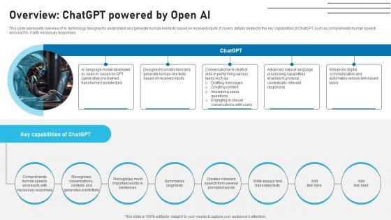 This slide represents overview of AI technology designed to understand and generate human-like texts based on received inputs. It covers details related to the key capabilities of ChatGPT such as comprehends human speech and react to it with necessary responses. Are you searching for a Overview ChatGPT Powered By Open AI Applications Of ChatGPT In Education ChatGPT SS V that is uncluttered, straightforward, and original Its easy to edit, and you can change the colors to suit your personal or business branding. For a presentation that expresses how much effort you have put in, this template is ideal With all of its features, including tables, diagrams, statistics, and lists, its perfect for a business plan presentation. Make your ideas more appealing with these professional slides. Download Overview ChatGPT Powered By Open AI Applications Of ChatGPT In Education ChatGPT SS V from Slidegeeks today. This slide represents overview of AI technology designed to understand and generate human-like texts based on received inputs. It covers details related to the key capabilities of ChatGPT such as comprehends human speech and react to it with necessary responses.