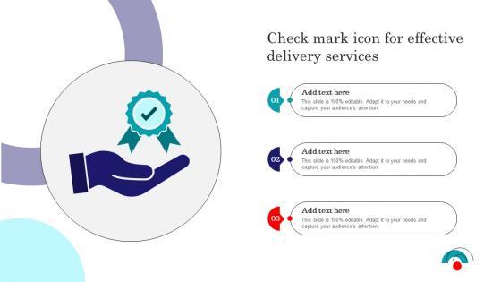 Showcasing this set of slides titled Check Mark Icon For Effective Delivery Services Infographics Pdf. The topics addressed in these templates are Check Mark, Effective Delivery Services. All the content presented in this PPT design is completely editable. Download it and make adjustments in color, background, font etc. as per your unique business setting. Our Check Mark Icon For Effective Delivery Services Infographics Pdf are topically designed to provide an attractive backdrop to any subject. Use them to look like a presentation pro.