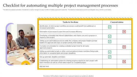 This slide showcases an automation checklist that is used by managers for easy workflow of multiple projects at the same time. The elements include tasks to be done and delegated, along with their current status. Showcasing this set of slides titled Checklist For Automating Multiple Project Management Processes Download Pdf. The topics addressed in these templates are Automating Multiple Project, Management Processes, Project Workflow Processes. All the content presented in this PPT design is completely editable. Download it and make adjustments in color, background, font etc. as per your unique business setting. This slide showcases an automation checklist that is used by managers for easy workflow of multiple projects at the same time. The elements include tasks to be done and delegated, along with their current status.
