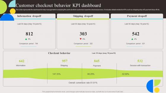 This slide represents the dashboard to help management in analyzing the point at which customers leave the checkout process. It includes details related to KPIs such as shipping drop off, payment drop off etc. Present like a pro with Customer Checkout Behavior KPI Evaluation And Deployment Of Enhanced Slides Pdf Create beautiful presentations together with your team, using our easy to use presentation slides. Share your ideas in real time and make changes on the fly by downloading our templates. So whether you are in the office, on the go, or in a remote location, you can stay in sync with your team and present your ideas with confidence. With Slidegeeks presentation got a whole lot easier. Grab these presentations today. This slide represents the dashboard to help management in analyzing the point at which customers leave the checkout process. It includes details related to KPIs such as shipping drop off, payment drop off etc.