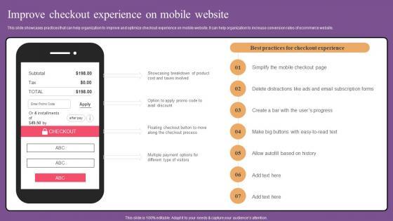 This slide showcases practices that can help organization to improve and optimize checkout experience on mobile website. It can help organization to increase conversion rates of ecommerce website. This modern and well arranged Improve Checkout Experience On Mobile Website Rules PDF provides lots of creative possibilities. It is very simple to customize and edit with the Powerpoint Software. Just drag and drop your pictures into the shapes. All facets of this template can be edited with Powerpoint no extra software is necessary. Add your own material, put your images in the places assigned for them, adjust the colors, and then you can show your slides to the world, with an animated slide included.