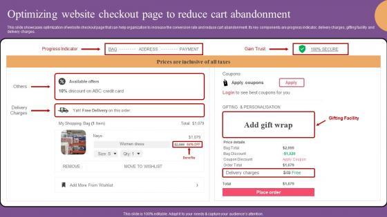 This slide showcases optimization of website checkout page that can help organization to increase the conversion rate and reduce cart abandonment. Its key components are progress indicator, delivery charges, gifting facility and delivery charges. The best PPT templates are a great way to save time, energy, and resources. Slidegeeks have 100 percent editable powerpoint slides making them incredibly versatile. With these quality presentation templates, you can create a captivating and memorable presentation by combining visually appealing slides and effectively communicating your message. Download Optimizing Website Checkout Page To Reduce Cart Abandonment Graphics PDF from Slidegeeks and deliver a wonderful presentation.