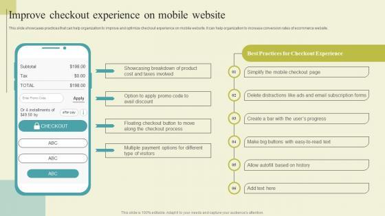 This slide showcases practices that can help organization to improve and optimize checkout experience on mobile website. It can help organization to increase conversion rates of ecommerce website. The best PPT templates are a great way to save time, energy, and resources. Slidegeeks have 100 percent editable powerpoint slides making them incredibly versatile. With these quality presentation templates, you can create a captivating and memorable presentation by combining visually appealing slides and effectively communicating your message. Download Successful Guide For Ecommerce Promotion Improve Checkout Experience On Mobile Elements Pdf from Slidegeeks and deliver a wonderful presentation. This slide showcases practices that can help organization to improve and optimize checkout experience on mobile website. It can help organization to increase conversion rates of ecommerce website.