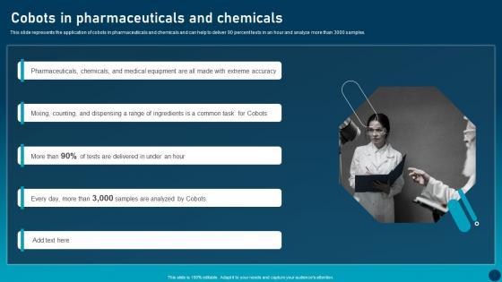 This slide represents the application of cobots in pharmaceuticals and chemicals and can help to deliver 90 percent tests in an hour and analyze more than 3000 samples. From laying roadmaps to briefing everything in detail, our templates are perfect for you. You can set the stage with your presentation slides. All you have to do is download these easy to edit and customizable templates. Cobots In Pharmaceuticals And Chemicals Detailed Analysis Of Cobots Guidelines PDF will help you deliver an outstanding performance that everyone would remember and praise you for. Do download this presentation today.