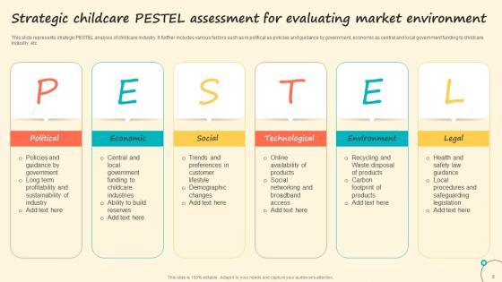 This slide represents strategic PESTEL analysis of childcare industry. It further includes various factors such as in political as policies and guidance by government, economic as central and local government funding to childcare industry, etc Pitch your topic with ease and precision using this Strategic Childcare Pestel Assessment For Evaluating Market Environment Summary Pdf This layout presents information on Political, Economic, Social, Technological It is also available for immediate download and adjustment. So, changes can be made in the color, design, graphics or any other component to create a unique layout. This slide represents strategic PESTEL analysis of childcare industry. It further includes various factors such as in political as policies and guidance by government, economic as central and local government funding to childcare industry, etc