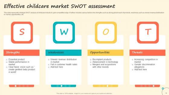 This slide represents strategic SWOT analysis of childcare industry to gain competitive edge. It further includes various factors like strengths such as strong global reach of products, weakness such as uneven revenue distribution in market, opportunities, etc Showcasing this set of slides titled Effective Childcare Market Swot Assessment Information Pdf The topics addressed in these templates are Strengths, Weaknesses, Opportunities, Threats All the content presented in this PPT design is completely editable. Download it and make adjustments in color, background, font etc. as per your unique business setting. This slide represents strategic SWOT analysis of childcare industry to gain competitive edge. It further includes various factors like strengths such as strong global reach of products, weakness such as uneven revenue distribution in market, opportunities, etc