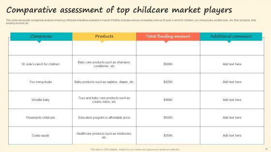 This slide represents comparison analysis of various childcare industries available in market. It further includes various companies such as St Judes ranch for children, you meng koala, woddle baby, etc, their products, total funding amount, etc Pitch your topic with ease and precision using this Comparative Assessment Of Top Childcare Market Players Download Pdf This layout presents information on Companies, Products, Additional Comment It is also available for immediate download and adjustment. So, changes can be made in the color, design, graphics or any other component to create a unique layout. This slide represents comparison analysis of various childcare industries available in market. It further includes various companies such as St Judes ranch for children, you meng koala, woddle baby, etc, their products, total funding amount, etc