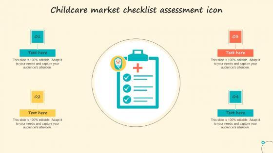 Showcasing this set of slides titled Childcare Market Checklist Assessment Icon Ideas Pdf The topics addressed in these templates are Childcare Market, Checklist Assessment Icon All the content presented in this PPT design is completely editable. Download it and make adjustments in color, background, font etc. as per your unique business setting. Our Childcare Market Checklist Assessment Icon Ideas Pdf are topically designed to provide an attractive backdrop to any subject. Use them to look like a presentation pro.