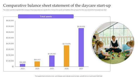 The slides cover the snapshot of the companys financial position at a specific time. It shows the assets and liabilities of the company from the year 2023 till the forecasted year 2027. Slidegeeks is one of the best resources for PowerPoint templates. You can download easily and regulate Comparative Balance Sheet Statement Of The Childcare Business Plan Template Pdf for your personal presentations from our wonderful collection. A few clicks is all it takes to discover and get the most relevant and appropriate templates. Use our Templates to add a unique zing and appeal to your presentation and meetings. All the slides are easy to edit and you can use them even for advertisement purposes. The slides cover the snapshot of the companys financial position at a specific time. It shows the assets and liabilities of the company from the year 2023 till the forecasted year 2027.