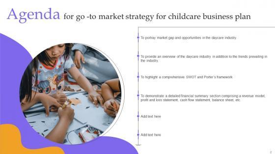 Find a pre-designed and impeccable Agenda For Go To Market Strategy For Childcare Business Plan Microsoft Pdf. The templates can ace your presentation without additional effort. You can download these easy-to-edit presentation templates to make your presentation stand out from others. So, what are you waiting for Download the template from Slidegeeks today and give a unique touch to your presentation. Our Agenda For Go To Market Strategy For Childcare Business Plan Microsoft Pdf are topically designed to provide an attractive backdrop to any subject. Use them to look like a presentation pro.