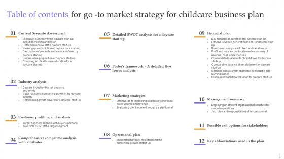 Presenting this PowerPoint presentation, titled Table Of Contents For Go To Market Strategy For Childcare Business Plan Template Pdf, with topics curated by our researchers after extensive research. This editable presentation is available for immediate download and provides attractive features when used. Download now and captivate your audience. Presenting this Table Of Contents For Go To Market Strategy For Childcare Business Plan Template Pdf. Our researchers have carefully researched and created these slides with all aspects taken into consideration. This is a completely customizable Table Of Contents For Go To Market Strategy For Childcare Business Plan Template Pdf that is available for immediate downloading. Download now and make an impact on your audience. Highlight the attractive features available with our PPTs. Our Table Of Contents For Go To Market Strategy For Childcare Business Plan Template Pdf are topically designed to provide an attractive backdrop to any subject. Use them to look like a presentation pro.