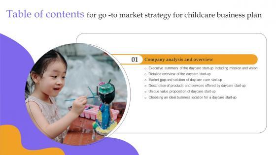 Make sure to capture your audiences attention in your business displays with our gratis customizable Go To Market Strategy For Childcare Business Plan Table Of Contents Download Pdf. These are great for business strategies, office conferences, capital raising or task suggestions. If you desire to acquire more customers for your tech business and ensure they stay satisfied, create your own sales presentation with these plain slides. Our Go To Market Strategy For Childcare Business Plan Table Of Contents Download Pdf are topically designed to provide an attractive backdrop to any subject. Use them to look like a presentation pro.