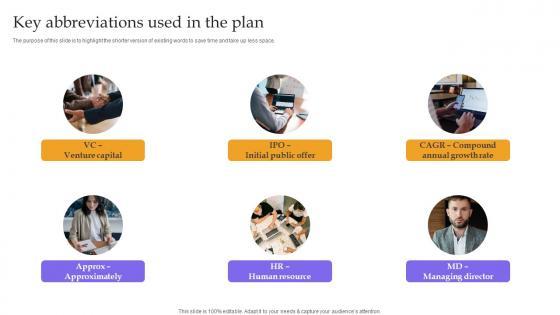 The purpose of this slide is to highlight the shorter version of existing words to save time and take up less space. This Key Abbreviations Used In The Plan Childcare Business Plan Sample Pdf is perfect for any presentation, be it in front of clients or colleagues. It is a versatile and stylish solution for organizing your meetings. The Key Abbreviations Used In The Plan Childcare Business Plan Sample Pdf features a modern design for your presentation meetings. The adjustable and customizable slides provide unlimited possibilities for acing up your presentation. Slidegeeks has done all the homework before launching the product for you. So, do not wait, grab the presentation templates today The purpose of this slide is to highlight the shorter version of existing words to save time and take up less space.
