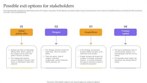 This slide represents exit strategy for stakeholders such as IPO, Mergers, Acquisitions, Private offerings, and Venture Capital. It gives a business owner a way to reduce or liquidate their stake in a business and, if the business is successful, make a substantial profit. Are you searching for a Possible Exit Options For Stakeholders Childcare Business Plan Clipart Pdf that is uncluttered, straightforward, and original Its easy to edit, and you can change the colors to suit your personal or business branding. For a presentation that expresses how much effort you have put in, this template is ideal With all of its features, including tables, diagrams, statistics, and lists, its perfect for a business plan presentation. Make your ideas more appealing with these professional slides. Download Possible Exit Options For Stakeholders Childcare Business Plan Clipart Pdf from Slidegeeks today. This slide represents exit strategy for stakeholders such as IPO, Mergers, Acquisitions, Private offerings, and Venture Capital. It gives a business owner a way to reduce or liquidate their stake in a business and, if the business is successful, make a substantial profit.