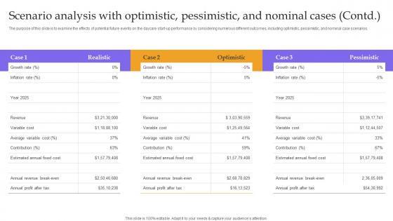 Scenario Analysis With Optimistic Pessimistic And Nominal Contd Childcare Business Plan Diagrams Pdf