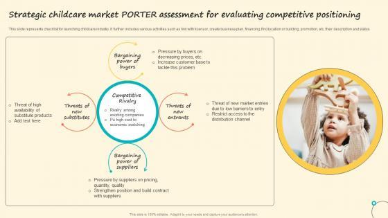 This slide represents checklist for launching childcare industry. It further includes various activities such as link with licensor, create business plan, financing, find location or building, promotion, etc, their description and status Showcasing this set of slides titled Strategic Childcare Market Porter Assessment For Evaluating Competitive Positioning Demonstration Pdf The topics addressed in these templates are New Substitutes, Bargaining Power, New Entrants All the content presented in this PPT design is completely editable. Download it and make adjustments in color, background, font etc. as per your unique business setting. This slide represents checklist for launching childcare industry. It further includes various activities such as link with licensor, create business plan, financing, find location or building, promotion, etc, their description and status