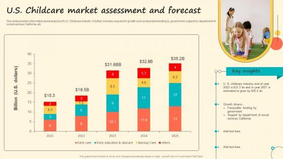 This slide provides information about analysis of U.S. Childcare industry. It further includes reasons for growth such as favorable funding by government, support by department of social services California, etc Showcasing this set of slides titled U S Childcare Market Assessment And Forecast Introduction Pdf The topics addressed in these templates are US Childcare, Market Assessment And Forecast All the content presented in this PPT design is completely editable. Download it and make adjustments in color, background, font etc. as per your unique business setting. This slide provides information about analysis of U.S. Childcare industry. It further includes reasons for growth such as favorable funding by government, support by department of social services California, etc