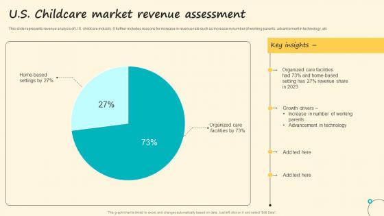This slide represents revenue analysis of U.S. childcare industry. It further includes reasons for increase in revenue rate such as increase in number of working parents, advancement in technology, etc Pitch your topic with ease and precision using this U S Childcare Market Revenue Assessment Microsoft Pdf This layout presents information on U S Childcare, Market Revenue Assessment It is also available for immediate download and adjustment. So, changes can be made in the color, design, graphics or any other component to create a unique layout. This slide represents revenue analysis of U.S. childcare industry. It further includes reasons for increase in revenue rate such as increase in number of working parents, advancement in technology, etc