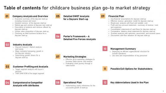 Presenting this PowerPoint presentation, titled Table Of Contents For Go To Market Strategy For Childcare Business Plan Template Pdf, with topics curated by our researchers after extensive research. This editable presentation is available for immediate download and provides attractive features when used. Download now and captivate your audience. Presenting this Table Of Contents For Go To Market Strategy For Childcare Business Plan Template Pdf. Our researchers have carefully researched and created these slides with all aspects taken into consideration. This is a completely customizable Table Of Contents For Go To Market Strategy For Childcare Business Plan Template Pdf that is available for immediate downloading. Download now and make an impact on your audience. Highlight the attractive features available with our PPTs. Our Table Of Contents For Go To Market Strategy For Childcare Business Plan Template Pdf are topically designed to provide an attractive backdrop to any subject. Use them to look like a presentation pro.