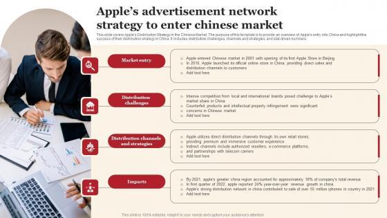 This slide covers Apples Distribution Strategy in the Chinese Market. The purpose of this template is to provide an overview of Apples entry into China and highlight the success of their distribution strategy in China. It includes distribution challenges, channels and strategies, and stat-driven numbers. Showcasing this set of slides titled Apples Advertisement Network Strategy To Enter Chinese Market Slides Pdf The topics addressed in these templates are Market Entry, Distribution Challenges, Channels And Strategies All the content presented in this PPT design is completely editable. Download it and make adjustments in color, background, font etc. as per your unique business setting. This slide covers Apples Distribution Strategy in the Chinese Market. The purpose of this template is to provide an overview of Apples entry into China and highlight the success of their distribution strategy in China. It includes distribution challenges, channels and strategies, and stat-driven numbers.