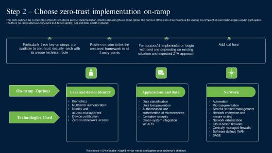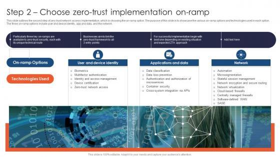 This slide outlines the second step of zero trust network access implementation, which is choosing the on-ramp option. The purpose of this slide is to showcase the various on-ramp options and technologies used in each option. The three on-ramp options include user and device identity, app and data, and the network. Slidegeeks is here to make your presentations a breeze with Step 2 Choose Zero Trust Implementation On Ramp Information PDF With our easy-to-use and customizable templates, you can focus on delivering your ideas rather than worrying about formatting. With a variety of designs to choose from, you are sure to find one that suits your needs. And with animations and unique photos, illustrations, and fonts, you can make your presentation pop. So whether you are giving a sales pitch or presenting to the board, make sure to check out Slidegeeks first