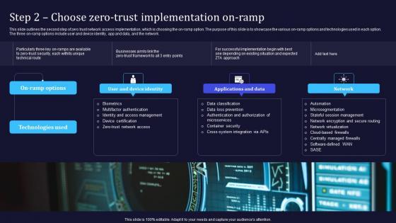 This slide outlines the second step of zero trust network access implementation, which is choosing the on-ramp option. The purpose of this slide is to showcase the various on-ramp options and technologies used in each option. The three on-ramp options include user and device identity, app and data, and the network. Want to ace your presentation in front of a live audience Our Step 2 Choose Zero Trust Implementation On Ramp Software Defined Perimeter SDP can help you do that by engaging all the users towards you. Slidegeeks experts have put their efforts and expertise into creating these impeccable powerpoint presentations so that you can communicate your ideas clearly. Moreover, all the templates are customizable, and easy-to-edit and downloadable. Use these for both personal and commercial use. This slide outlines the second step of zero trust network access implementation, which is choosing the on-ramp option. The purpose of this slide is to showcase the various on-ramp options and technologies used in each option. The three on-ramp options include user and device identity, app and data, and the network.