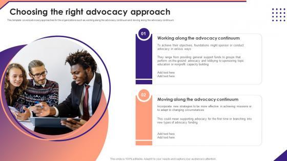 This template covers advocacy approaches for the organizations such as working along the advocacy continuum and moving along the advocacy continuum. Get a simple yet stunning designed Choosing The Right Advocacy Approach Not For Profit Venture Playbook Professional Pdf. It is the best one to establish the tone in your meetings. It is an excellent way to make your presentations highly effective. So, download this PPT today from Slidegeeks and see the positive impacts. Our easy to edit Choosing The Right Advocacy Approach Not For Profit Venture Playbook Professional Pdf can be your go to option for all upcoming conferences and meetings. So, what are you waiting for Grab this template today. This template covers advocacy approaches for the organizations such as working along the advocacy continuum and moving along the advocacy continuum.