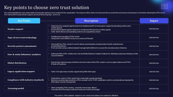 This slide highlights the main criteria while choosing the right zero trust solution for the organization. The purpose of this slide is to showcase the key points the businesses should keep in mind while selecting the ZTNA vendor. The main points include vendor support, zero trust technology type, and so on. This Zero Trust Network Access Key Points To Choose Zero Trust Solution from Slidegeeks makes it easy to present information on your topic with precision. It provides customization options, so you can make changes to the colors, design, graphics, or any other component to create a unique layout. It is also available for immediate download, so you can begin using it right away. Slidegeeks has done good research to ensure that you have everything you need to make your presentation stand out. Make a name out there for a brilliant performance. This slide highlights the main criteria while choosing the right zero trust solution for the organization. The purpose of this slide is to showcase the key points the businesses should keep in mind while selecting the ZTNA vendor. The main points include vendor support, zero trust technology type, and so on.