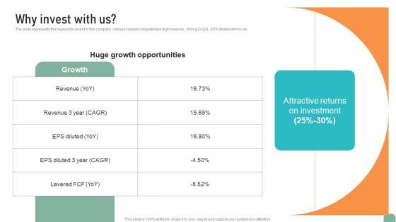 The slide represents the reasons to invest in the company. Various reasons included are high revenue, strong CAGR, EPS diluted and so on Welcome to our selection of the Why Invest With Us Circuit Designing Company Investor Fund Raising Pitch Deck Designs Pdf. These are designed to help you showcase your creativity and bring your sphere to life. Planning and Innovation are essential for any business that is just starting out. This collection contains the designs that you need for your everyday presentations. All of our PowerPoints are 100 percent editable, so you can customize them to suit your needs. This multi purpose template can be used in various situations. Grab these presentation templates today The slide represents the reasons to invest in the company. Various reasons included are high revenue, strong CAGR, EPS diluted and so on