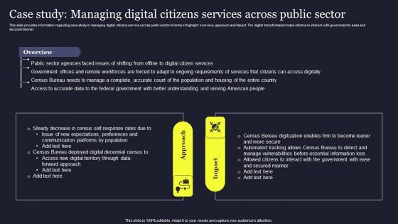 This slide provides information regarding case study in managing digital citizens service across public sector in terms of highlight overview, approach and impact. The digital transformation helps citizens to interact with government in ease and secured manner. Create an editable Case Study Managing Digital Citizens Playbook For Managing Us Topics Pdf that communicates your idea and engages your audience. Whether you are presenting a business or an educational presentation, pre-designed presentation templates help save time. Case Study Managing Digital Citizens Playbook For Managing Us Topics Pdf is highly customizable and very easy to edit, covering many different styles from creative to business presentations. Slidegeeks has creative team members who have crafted amazing templates. So, go and get them without any delay. This slide provides information regarding case study in managing digital citizens service across public sector in terms of highlight overview, approach and impact. The digital transformation helps citizens to interact with government in ease and secured manner.