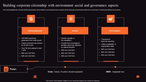 This slide highlights the corporate citizenship towards environmental, social and governance aspects which showcases electricity generation from solar power, and transparent financial reporting. Slidegeeks is one of the best resources for PowerPoint templates. You can download easily and regulate Building Corporate Citizenship With Environment Social And Governance Aspects Template PDF for your personal presentations from our wonderful collection. A few clicks is all it takes to discover and get the most relevant and appropriate templates. Use our Templates to add a unique zing and appeal to your presentation and meetings. All the slides are easy to edit and you can use them even for advertisement purposes.