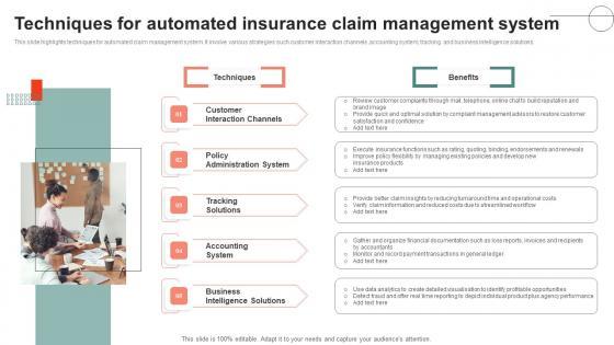 This slide highlights techniques for automated claim management system. It involve various strategies such customer interaction channels ,accounting system, tracking and business intelligence solutions. Pitch your topic with ease and precision using this Techniques For Automated Insurance Claim Management System Themes Pdf This layout presents information on Customer Interaction, Policy Administration, Tracking Solutions It is also available for immediate download and adjustment. So, changes can be made in the color, design, graphics or any other component to create a unique layout. This slide highlights techniques for automated claim management system. It involve various strategies such customer interaction channels ,accounting system, tracking and business intelligence solutions.