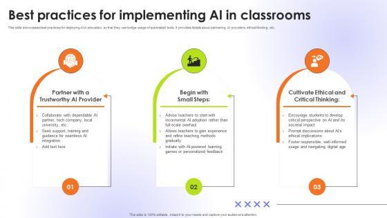 This slide showcases best practices for deploying AI in education, so that they can bridge usage of automated tools. It provides details about partnering, AI providers, ethical thinking, etc. Do you have an important presentation coming up Are you looking for something that will make your presentation stand out from the rest Look no further than Best Practices For Implementing AI In Classrooms Educational Transformation Through AI SS V. With our professional designs, you can trust that your presentation will pop and make delivering it a smooth process. And with Slidegeeks, you can trust that your presentation will be unique and memorable. So why wait Grab Best Practices For Implementing AI In Classrooms Educational Transformation Through AI SS V today and make your presentation stand out from the rest This slide showcases best practices for deploying AI in education, so that they can bridge usage of automated tools. It provides details about partnering, AI providers, ethical thinking, etc.