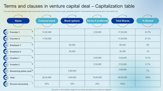This slide outlines the capitalization table and provides brief overview of a companys equity ownership structure. Top elements include common stock, stock options, etc. Coming up with a presentation necessitates that the majority of the effort goes into the content and the message you intend to convey. The visuals of a PowerPoint presentation can only be effective if it supplements and supports the story that is being told. Keeping this in mind our experts created Terms And Clauses In Venture Capital Deal Raising Venture Capital A Holistic Approach Fin SS V to reduce the time that goes into designing the presentation. This way, you can concentrate on the message while our designers take care of providing you with the right template for the situation. This slide outlines the capitalization table and provides brief overview of a companys equity ownership structure. Top elements include common stock, stock options, etc.