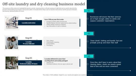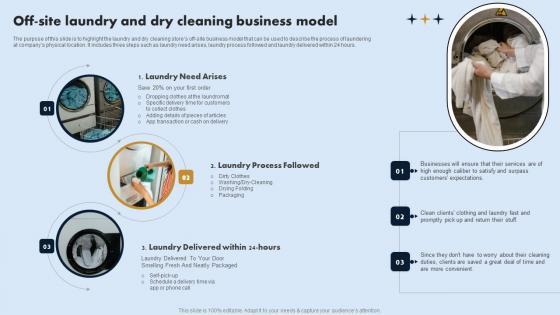 The purpose of this slide is to highlight the laundry and dry cleaning stores off-site business model that can be used to describe the process of laundering at companys physical location. It includes three steps such as laundry need arises, laundry process followed and laundry delivered within 24 hours. If you are looking for a format to display your unique thoughts, then the professionally designed Off Site Laundry And Dry Cleaning Business Model Template PDF is the one for you. You can use it as a Google Slides template or a PowerPoint template. Incorporate impressive visuals, symbols, images, and other charts. Modify or reorganize the text boxes as you desire. Experiment with shade schemes and font pairings. Alter, share or cooperate with other people on your work. Download Off Site Laundry And Dry Cleaning Business Model Template PDF and find out how to give a successful presentation. Present a perfect display to your team and make your presentation unforgettable.