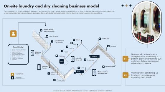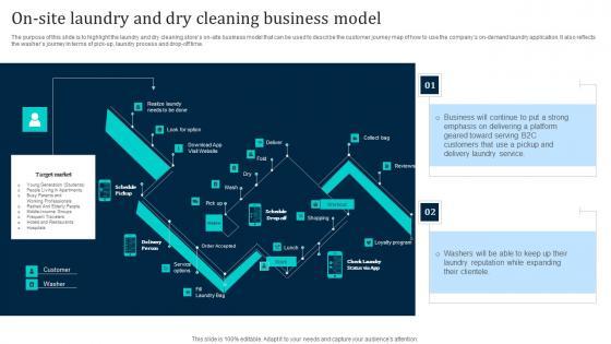 The purpose of this slide is to highlight the laundry and dry cleaning stores on-site business model that can be used to describe the customer journey map of how to use the companys on-demand laundry application. It also reflects the washers journey in terms of pick-up, laundry process and drop-off time.The On Site Laundry And Dry Cleaning Business Model Laundromat Business Plan Go To Market Ideas Pdf is a compilation of the most recent design trends as a series of slides. It is suitable for any subject or industry presentation, containing attractive visuals and photo spots for businesses to clearly express their messages. This template contains a variety of slides for the user to input data, such as structures to contrast two elements, bullet points, and slides for written information. Slidegeeks is prepared to create an impression. The purpose of this slide is to highlight the laundry and dry cleaning stores on site business model that can be used to describe the customer journey map of how to use the companys on demand laundry application. It also reflects the washers journey in terms of pick up, laundry process and drop off time.