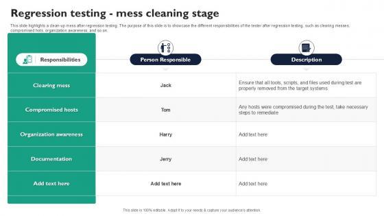 This slide highlights a clean-up mess after regression testing. The purpose of this slide is to showcase the different responsibilities of the tester after regression testing, such as clearing messes, compromised hots, organization awareness, and so on. Slidegeeks is here to make your presentations a breeze with Regression Testing Mess Cleaning Stage Corrective Regression Testing Ppt Slides With our easy-to-use and customizable templates, you can focus on delivering your ideas rather than worrying about formatting. With a variety of designs to choose from, you are sure to find one that suits your needs. And with animations and unique photos, illustrations, and fonts, you can make your presentation pop. So whether you are giving a sales pitch or presenting to the board, make sure to check out Slidegeeks first This slide highlights a clean up mess after regression testing. The purpose of this slide is to showcase the different responsibilities of the tester after regression testing, such as clearing messes, compromised hots, organization awareness, and so on.
