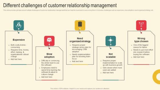 This slide provides glimpse about multiple challenges of customer relationship management that can help the business to overcoming them. It includes challenges such as expensive, slow adoption, need organized strategy, etc. Boost your pitch with our creative Different Challenges Of Customer Marketing Plan For Boosting Client Retention In Retail Banking Inspiration Pdf. Deliver an awe inspiring pitch that will mesmerize everyone. Using these presentation templates you will surely catch everyones attention. You can browse the ppts collection on our website. We have researchers who are experts at creating the right content for the templates. So you do not have to invest time in any additional work. Just grab the template now and use them. This slide provides glimpse about multiple challenges of customer relationship management that can help the business to overcoming them. It includes challenges such as expensive, slow adoption, need organized strategy, etc.