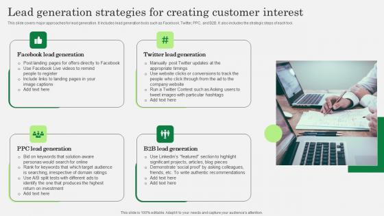 This slide covers major approaches for lead generation. It includes lead generation tools such as Facebook, Twitter, PPC, and B2B. It also includes the strategic steps of each tool. Coming up with a presentation necessitates that the majority of the effort goes into the content and the message you intend to convey. The visuals of a PowerPoint presentation can only be effective if it supplements and supports the story that is being told. Keeping this in mind our experts created Optimizing Client Lead Handling Lead Generation Strategies For Creating Structure Pdf to reduce the time that goes into designing the presentation. This way, you can concentrate on the message while our designers take care of providing you with the right template for the situation. This slide covers major approaches for lead generation. It includes lead generation tools such as Facebook, Twitter, PPC, and B2B. It also includes the strategic steps of each tool.