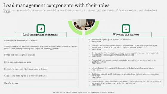 This slide covers major elements of the lead management process with their importance. It includes components such as sales ready lead, developing lead stage definitions, lead processing by source, lead routing rule and alerts, etc. Welcome to our selection of the Optimizing Client Lead Handling Lead Management Components With Their Roles Rules Pdf. These are designed to help you showcase your creativity and bring your sphere to life. Planning and Innovation are essential for any business that is just starting out. This collection contains the designs that you need for your everyday presentations. All of our PowerPoints are 100 percent editable, so you can customize them to suit your needs. This multi-purpose template can be used in various situations. Grab these presentation templates today. This slide covers major elements of the lead management process with their importance. It includes components such as sales ready lead, developing lead stage definitions, lead processing by source, lead routing rule and alerts, etc.